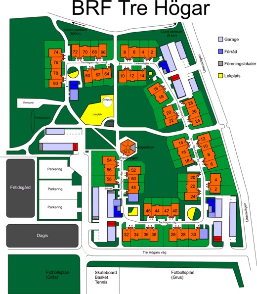 Det finns två olika gatuadresser inom föreningen: Tre Högars väg (förkortas THv) och Linerovägen (förkortas Lv), se översiktsplan.